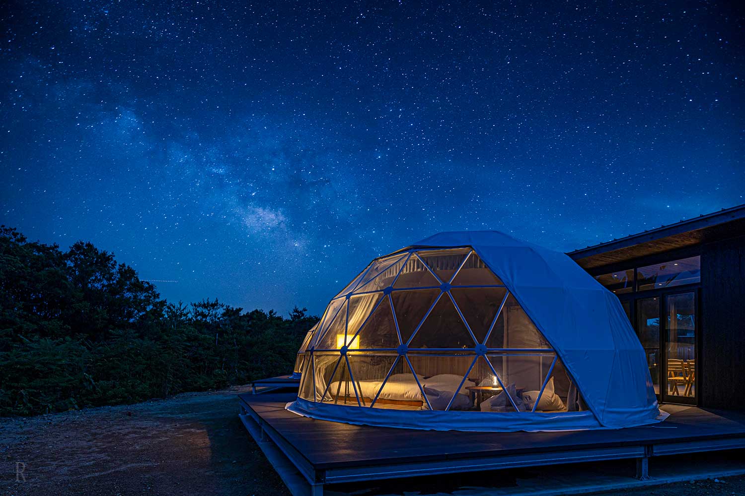 7棟のドーム型テントは、広々としたデッキスペースを備えたプライベート空間が魅⼒的。