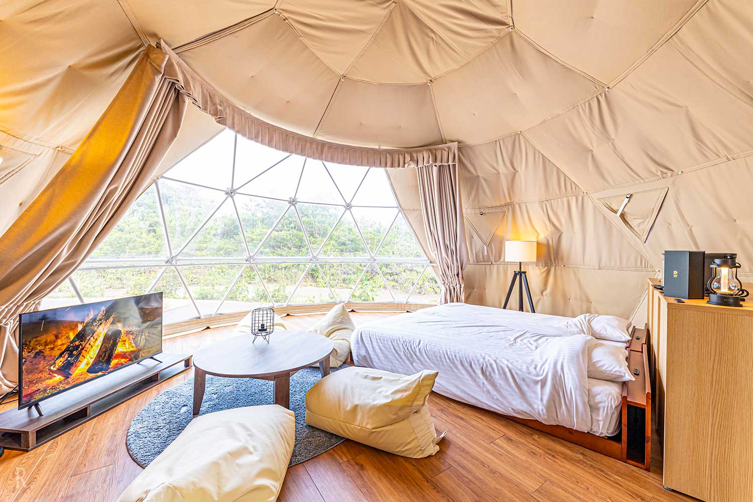7棟のドーム型テントは、広々としたデッキスペースを備えたプライベート空間が魅⼒的。冷暖房完備のドーム型テント内には、シングルベッドを2台とエキストラを備え、4名までゆったりとお泊まりいただけます。お部屋は「スタンダードドーム」とスマートTV付きの「デラックスドーム」の2タイプよりお選びいただけます。快適なドーム型テントでのグランピングをご体験ください。